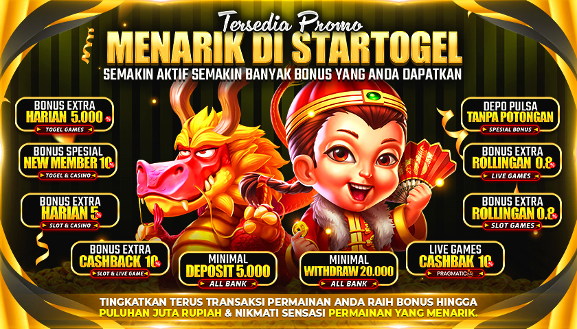 SELAMAT DATANG DI STARTOGEL BANDAR TOGEL ONLINE, LIVE CASINO ONLINE DAN SLOT ONLINE TERPERCAYA - MINIMAL DEPOSIT RP 5.000,- | MINIMAL WITHDRAW RP 20.000,- | MINIMAL BET 100 PERAK ALL PASARAN | MINIMAL BET SLOT 400 PERAK.